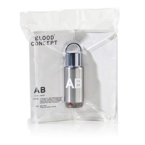 Perfume AB (группа крови IV)  - минеральная композиция с участием альдегидов, аллюминия и тёса (камня) в верхних нотах, гравия и воды в сердце и кедра и металлических нот в основе.