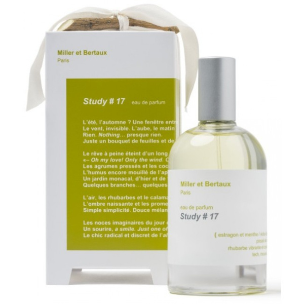 Study #17 от Miller et Bertaux аромат относится к группе цветочные древесно - мускусные, создан в 2015 году. Состав парфюмерной композиций бергамот, мята, зеленые ноты, цитрусные нотыжасмин, черная смородина, герань, ревеньдубовый мох, пачули. Парфюмер создавший данную композицию