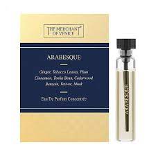 Arabesque от The Merchant of Venice аромат относится к группе восточные древесные, создан в 2015 году. Состав парфюмерной композиций имбирь, слива, табакбобы Тонка, корица, белый кедрмускус, ветивер, бензоин. Парфюмер создавший данную композицию